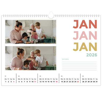 Kein Grund, bis zum Januar zu warten – du kannst deinen Kalender im Querformat mit jedem beliebigen Monat beginnen. Perfekt für Schulkalender, Geschäftskalender und mehr.